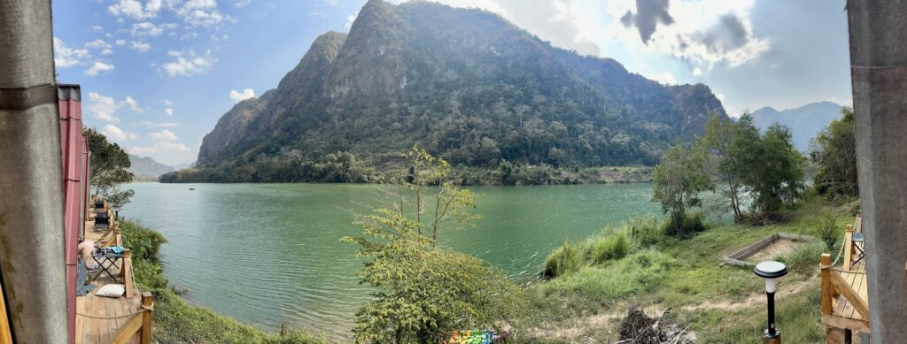 Nong Khiaw: Papaya Resort. “Resort” is a bit of a stretch but this is a new offering with sixteen bungalows looking out over the Nam Ou river, a beautiful setting offering great sunrise and sunset viewing. Great shower and a heated toilet seat (not sure why). There’s a restaurant attached for breakfast (not included) and other meals, and while the organisation is a bit chaotic, the food is really good. It’s a little way out of the town but only five minutes ride.