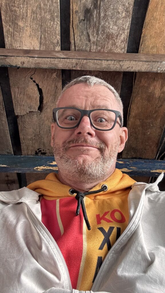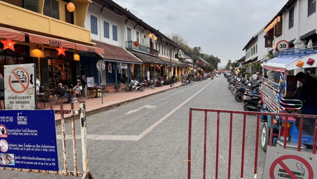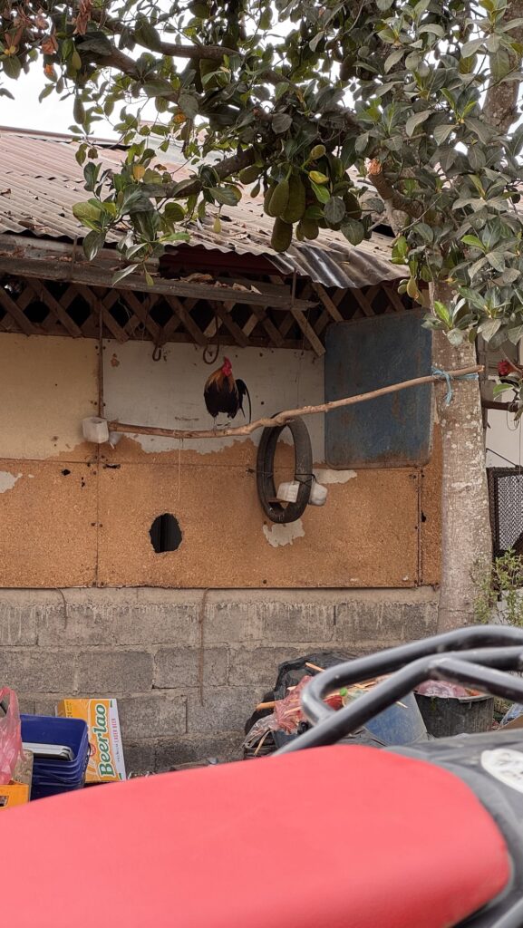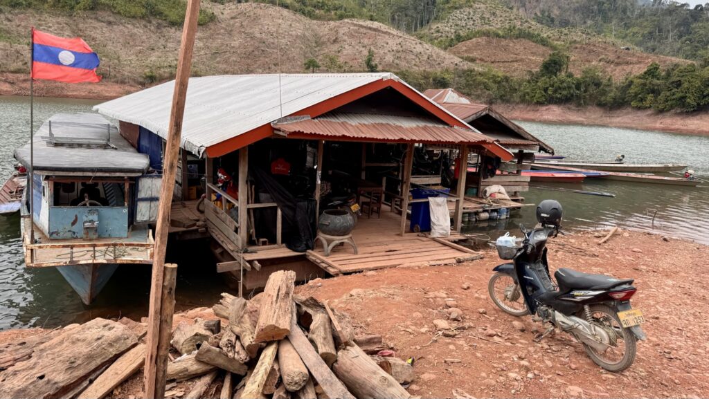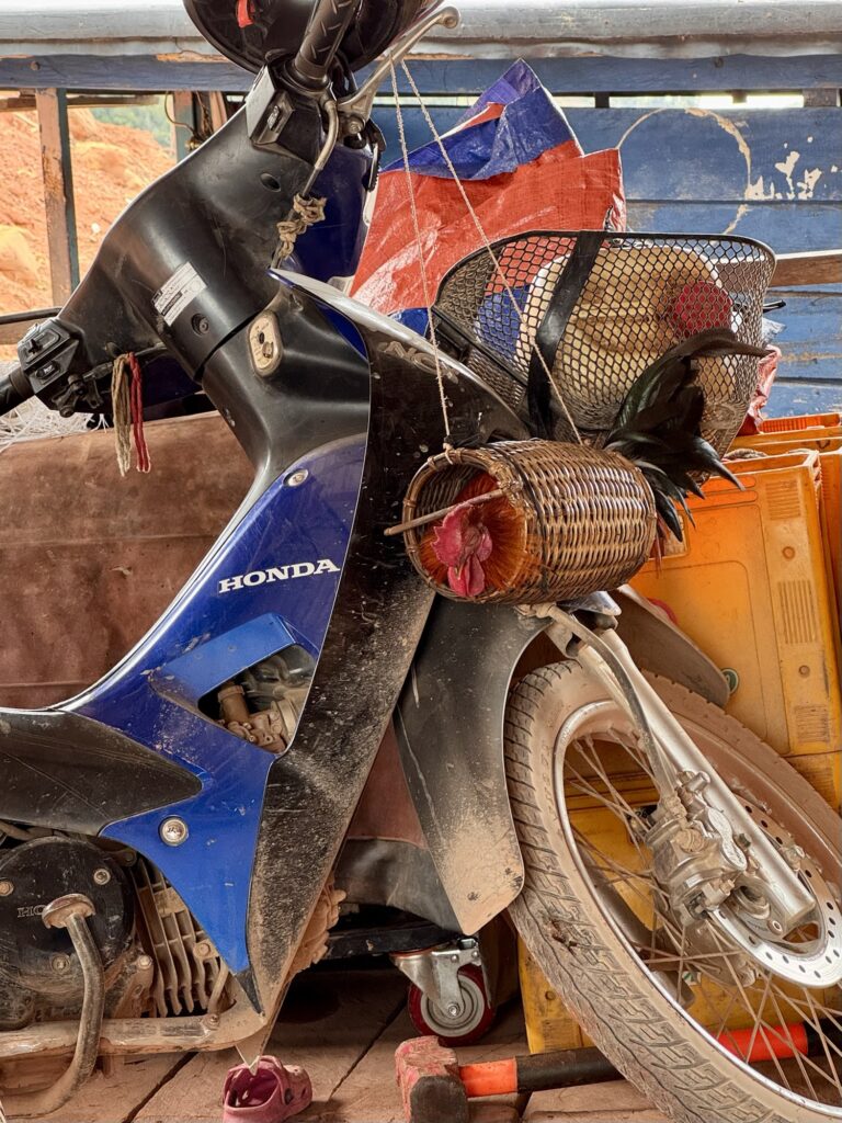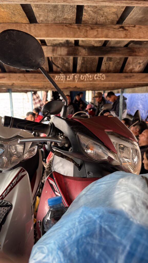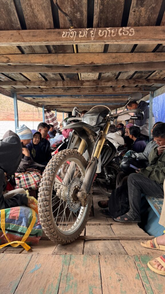 I’m getting a little concerned that there won’t be room for my relatively large bike (just be glad it’s not a GS1200…) but reassure myself with the general impression that I get from the Lao that “we’ll make it happen” and indeed he does, with the support of about five other guys to manhandle my bike into position.
